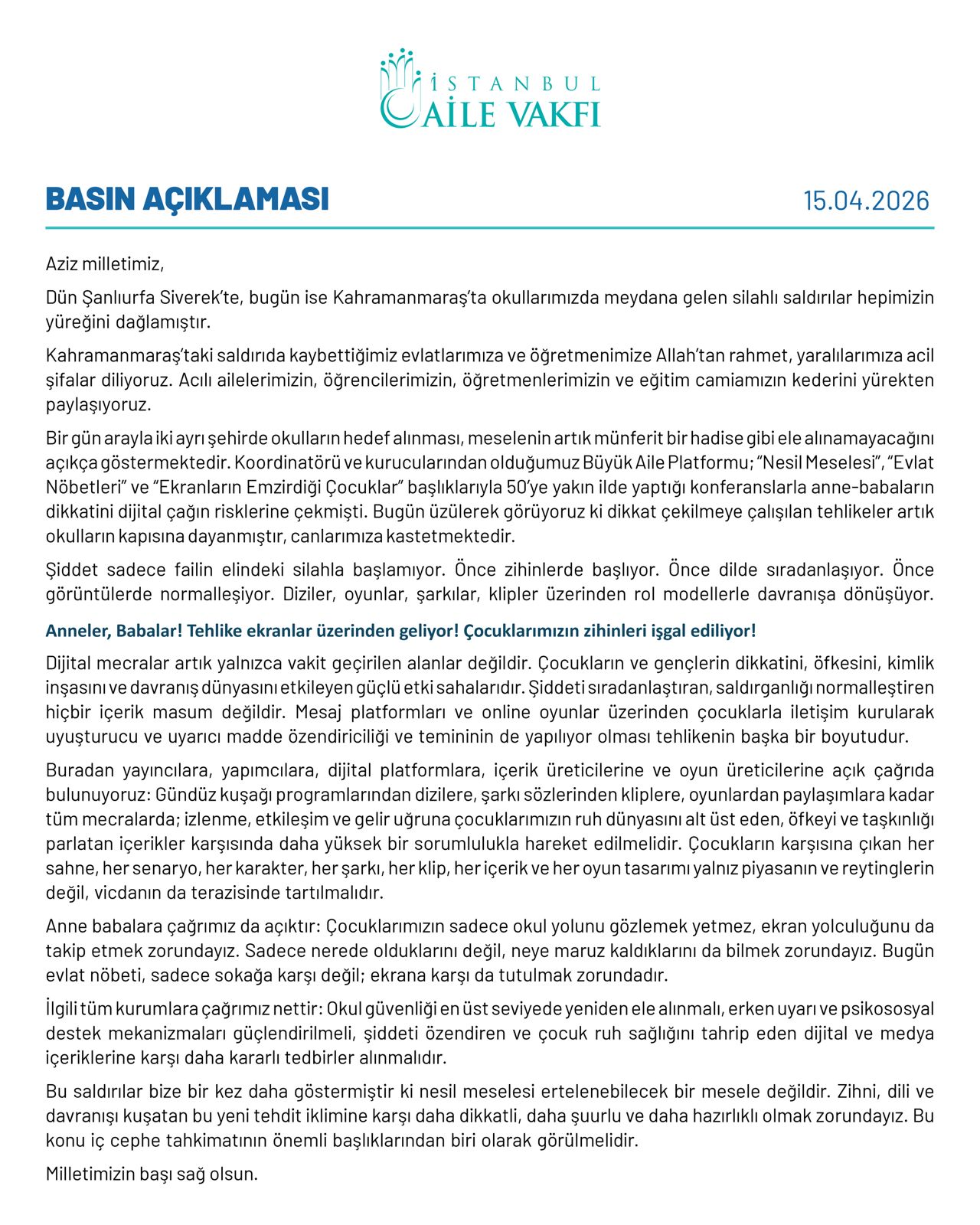 İstanbul Aile Vakfı, Şanlıurfa’nın Siverek ilçesi ile Kahramanmaraş’ta okullarda meydana gelen silahlı saldırılara ilişkin yazılı bir basın açıklaması yayımladı.