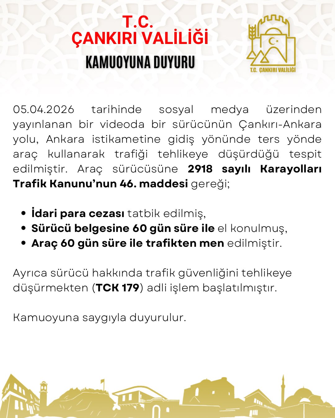 Yapılan inceleme sonucunda sürücüye, 2918 sayılı Karayolları Trafik Kanunu’nun 46. maddesi kapsamında idari para cezası uygulandı. Ayrıca trafik güvenliğini tehlikeye düşürdüğü gerekçesiyle sürücünün ehliyetine 60 gün süreyle el konuldu. Sürücünün aracı da 60 gün süreyle trafikten men edildi.